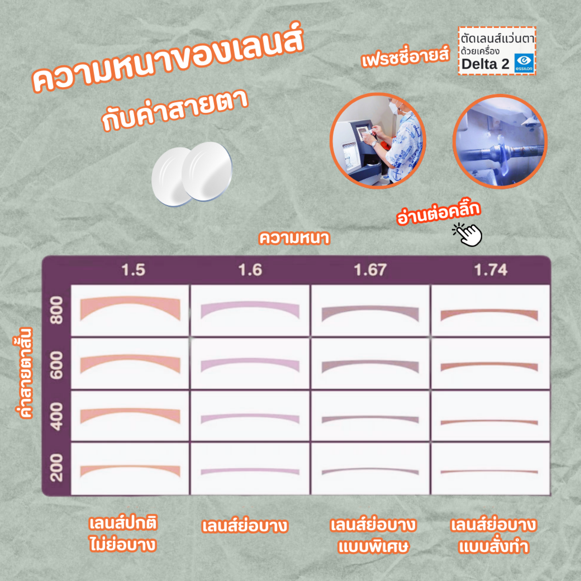 เมื่อเราไปตัดแว่น ให้ระวังความหนาของเลนส์ให้ดี เพราะค่าสายตาเยอะมากเท่าไหร่เลนส์ก็จะยิ่งหนาเพื่อรองรับปัญหาสายตาของเรา ปัญหาคือหนาปุ๊บก็หนักสิจ๊ะ แต่ถ้าหากอยากได้เลนส์บางๆสามารถเลือกได้ เป็นเลนส์ย่อบาง แค่นี้เราก็จะได้เลนส์บาง ๆ น้ำหนักเบา ไม่ต้องกลัวดั้งยุบ โดยระดับการย่อที่มีให้เลือกก็จะแบ่งระดับได้ตามนี้ ซึ่งราคาก็จะแตกต่างกันไป