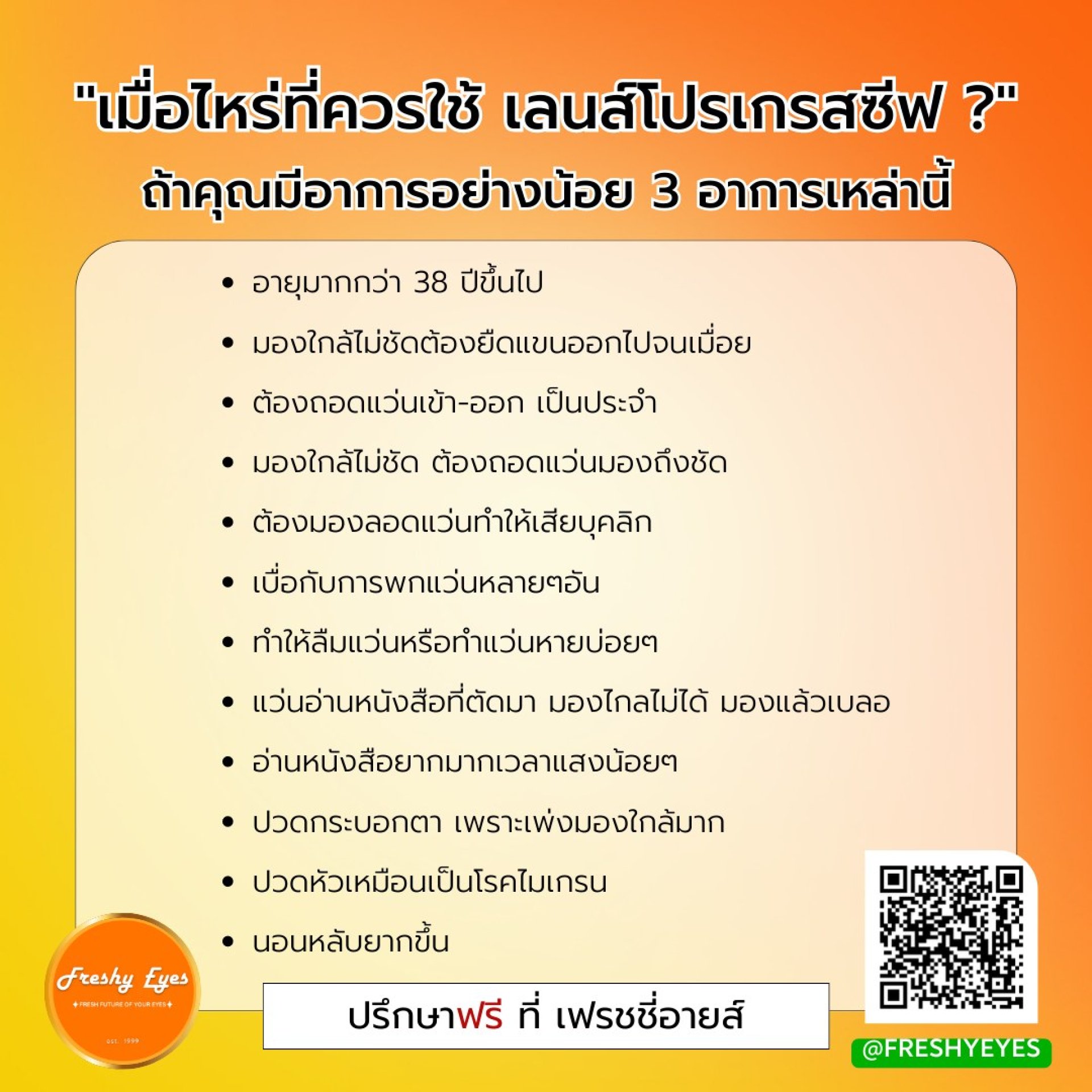 คุณควรใช้เลนส์โปรเกรสซีฟเมื่อเริ่มมีอาการสายตายาวตามวัย ทำให้มองใกล้ไม่ชัด หรือต้องใช้แว่นหลายอันเพื่อมองในระยะต่างๆ รวมถึงผู้ที่มีปัญหาสายตาหลายระยะร่วมกัน (เช่น สายตาสั้นและสายตายาว) และต้องการความสะดวกสบายในการมองเห็นทุกระยะในแว่นอันเดียว หากมีอาการอย่างน้อย 3 อาการเหล่านี้ ควรปรึกษาหมอสายตา นักทัศนมาตรหรือผู้เชี่ยวชาญด้านเลนส์โปรเกรสซีฟ เพื่อแก้ปัญหาสายตาของท่าน